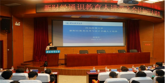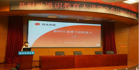 4月21日下午,新财经通识教育大讲堂---会计知行大讲堂在国际学术报告厅举行,公司党委常委、副董事长程瑞芳和河北资产管理公司总会计师马莹分别做了题为“新财经教育改革与会计卓越人才培养”和“新时代背景下的财务人”的主题报告。fun88乐天使图书馆馆长武占江、副馆长樊俊荣、“会计知行大讲堂”部分实务界讲师和乐天使220余名师生参加了本次宣讲会。宣讲会由乐天使经理袁振兴主持。
