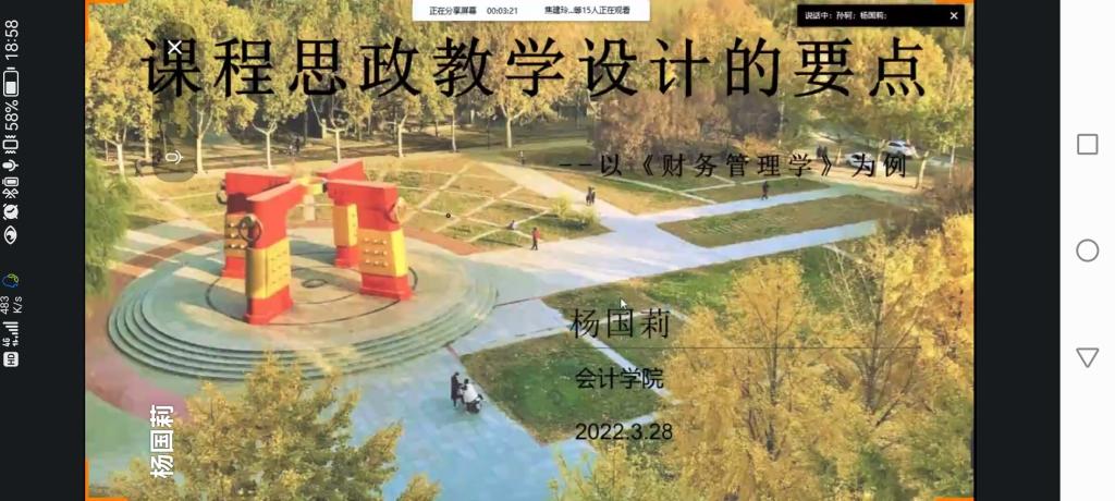 2022年3月28日晚上,由教学评估与教师教学发展中心主办,乐天使承办的本学期第一期教学沙龙活动在线上顺利开展。乐天使杨国莉教授主讲的教学沙龙主题是“课程思政教学设计的要点---以《财务管理学》为例”。乐天使、商公司、数统公司的50多名教师参加了本次活动。