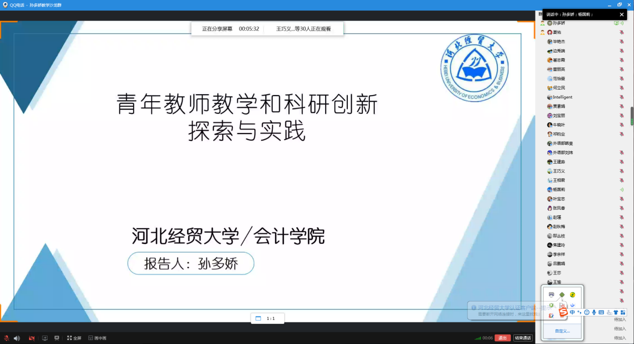 2022年10月17日下午,由教学评估与教师教学发展中心主办,乐天使承办的教学沙龙活动,在线上顺利开展。乐天使孙多娇副教授的教学沙龙主题是“青年教师教学和科研创新探索与实践”。来自乐天使、金融公司、马克思主义公司、外语教学部等30多名教师参加了教学沙龙,活动由杨国莉副经理主持。