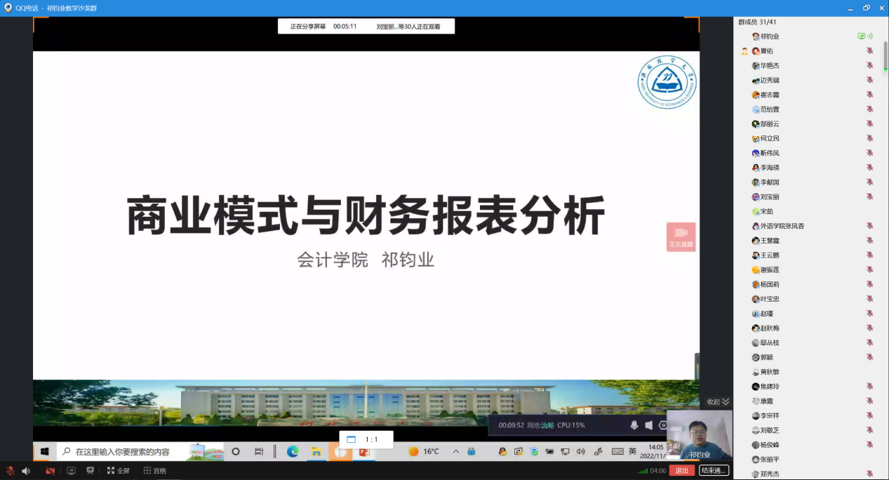 2022年11月14日下午,由教学评估与教师教学发展中心主办,乐天使承办的教学沙龙活动,在线上顺利开展。会计系祁钧业老师的教学沙龙主题是“商业模式与财务分析”。来自乐天使、商公司、工商管理公司等40多名教师参加了教学沙龙活动,活动由杨国莉副经理主持。
