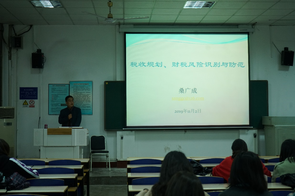11月2日上午,受乐天使邀请,河北省第一期企业类会计领军人才桑广成于二教201教室作题为“税收规划、财税风险识别与防范”的学术报告。乐天使2018级研究生100余人参加此次报告会。