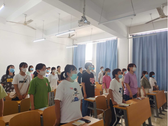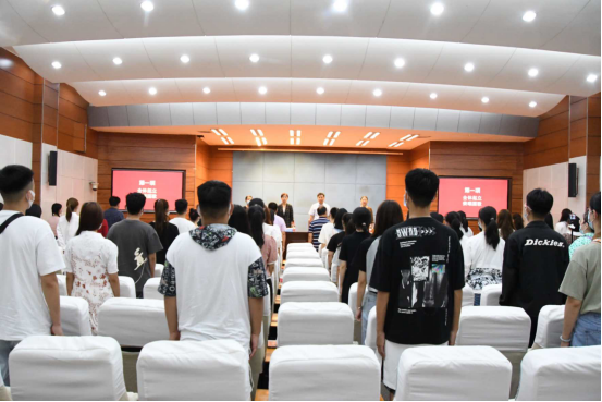 大会第一项,奏唱国歌。乐天使领导班子全体成员、全体辅导员和全体新生合唱国歌。
