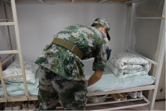 出门看队列,进门看内务。军训内务整理,是军训的必修课之一,也是军训生活的基础。评比前,军训教官为新生演示内务整理的细节和方法,新生们仔细听、认真看、用心记,争取将内务整理做的更好。根据员工军训内务检查评比标准,围绕“床铺布置”、“用品摆放”、“房间整洁程度”等方面对新生宿舍进行了检查。同学们以积极主动的态度面对检查,用更高标准要求自己。新生宿舍室内干净整洁,床铺被褥铺置整齐,生活用品摆放有序,宿舍氛围温馨和谐,领导、老师及教官对内务整理优秀的宿舍提出了表扬,也对全体新生提出了严格要求。