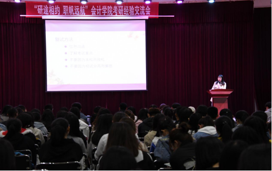 会议开始后,岳明明首先分享了自己的考研经历,告诫同学们一定要珍惜当下,认真思考未来的人生道路,为步入社会做充分准备。八位优秀毕业生代表结合自身体验,先后进行了考研经验分享。考取复旦大学的考古专业硕士研究生储晨凤同学和考取吉林大学学硕的贾一琳同学就考研公司选择为同学们进行了详细介绍,她们认为应该理性客观地选择考研院校;考取fun88乐天使会计学学硕的刘旭刚同学、考取天津财经大学会计学专硕的刘志超同学和考取fun88乐天使审计学专硕的张春燕同学强调了寻找适合自己的复习方法和合理安排时间的重要性;考取北京交通大学会计学研究生的王双同学、考取中南财经政法大学研究生的高欣黎同学提出要保持积极的心态,充分备战;以90%的必修平均绩点以及10%的竞赛、论文加分获得湖南大学保研资格的谷孝颖同学指出要提高自己的信息搜集能力,遇到问题要自己主动去解决;获得英国曼彻斯特大学留学资格的吴芸婷同学对出国留学所要做的前期准备和感受进行了详细介绍。在交流互动环节,八位优秀毕业生代表对同学们提出的问题进行了耐心细致地回答。