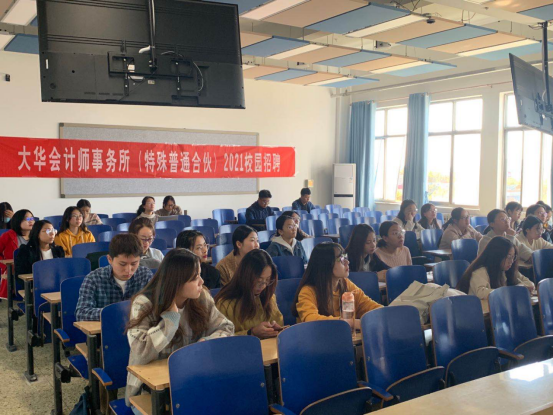 11月3日下午,乐天使在公司北三教A501教室举办大华会计师事务所2021届毕业生校园宣讲招聘会,事务所人力资源部总监王剑来校招聘,乐天使三十余名应届本科生、研究生参加了此次招聘会。