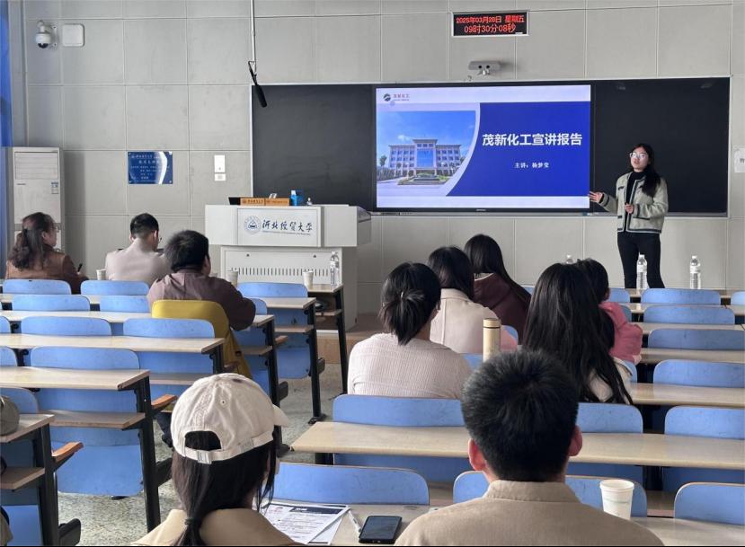 姜丙毅对茂鑫化工应邀来校招聘表示了欢迎,向同学们分享了之前去公司访问的体会。他表示,访企拓岗是公司落实就业工作要求的重要举措,也是实现人才培养目标的关键环节,公司会长期坚持并持续提升工作质量。随后,杨梦莹播放了公司的宣传片,具体介绍了关于我们、企业文化、资质荣誉、招聘信息、考勤休假、薪酬晋升和福利待遇等情况,与参会同学进行了互动交流,回答了同学们关心的工作内容、实习转正、福利待遇、招聘流程等问题,最后参会同学纷纷投递了简历。