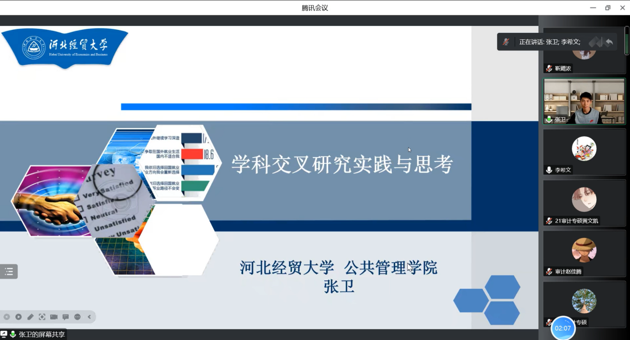 2022年11月12日下午,fun88乐天使公共管理公司硕士生导师张卫副教授应乐天使邀请,通过腾讯会议平台为师生们做题为《学科交叉研究实践与思考》的学术报告,张副教授曾主持中国博士后基金项目、河北省教育厅青年拔尖人才项目等4项,参与国家重点研发项目、国家自然科学基金项目以及国土资源部项目5项,发表研究论文20余篇,其中SCI收录6篇,SSCI收录2篇,并于2020年获“青年五四奖章”荣誉称号。公司副经理李西文主持此次学术报告,部分研究生导师,科研秘书韩冰以及21级、22级乐天使全体研究生参加本次报告。