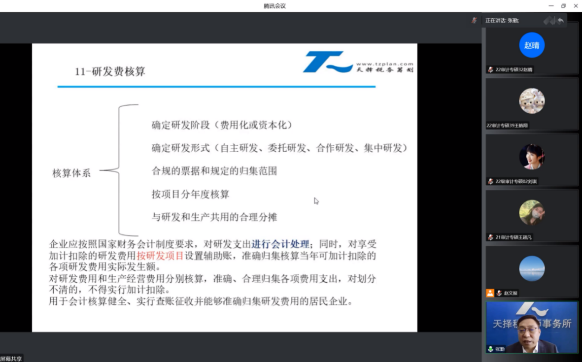 2022年10月7日上午,天择税务师事务所河北分所总经理张勤应乐天使邀请,通过腾讯会议为师生们做题为《研发费用加计扣除理论与实操问题探究》的主题报告。党委书记赵文报主持此次讲座,科研秘书韩冰、部分导师以及21级、22级乐天使全体研究生参加本次讲座。