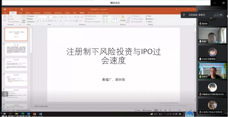 最后,黄福广教授讲解了以2014至2021年在“新三板”挂牌并申报IPO的公司为样本展开研究的思路和过程,得出风投或高收益风投企业IPO更快,注册制企业较核准制企业IPO速度更快等结论。