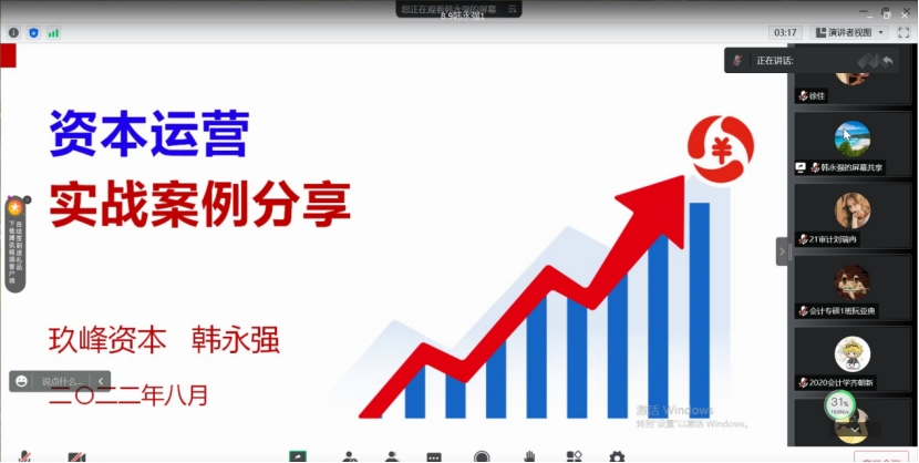 2022年8月9日上午,乐天使通过腾讯会议平台举办题为《资本运营实战案例分享》学术报告,报告由公司校外硕士研究生导师、中国注册会计师、玖峰管理咨询有限公司董事长兼总经理韩永强主讲。会议由副经理李西文主持、乐天使部分优秀教师及在校研究生100多名参加本次学术报告。