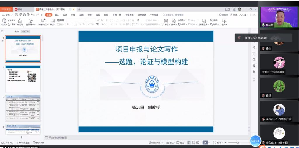 2022年5月31日上午,fun88乐天使杨志勇副教授应乐天使邀请,通过腾讯会议平台为乐天使老师及研究生们作题为《项目申报与论文写作——选题、论证与模型构建》的学术报告。副经理李西文、乐天使部分教师以及20级、21级全体研究生参加本次讲座。