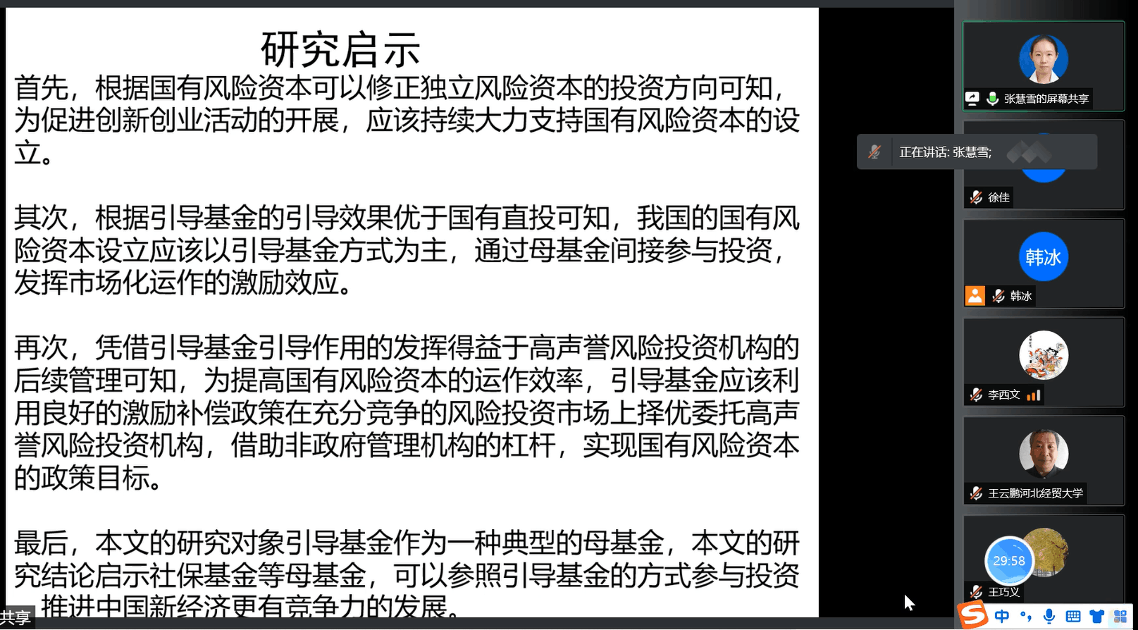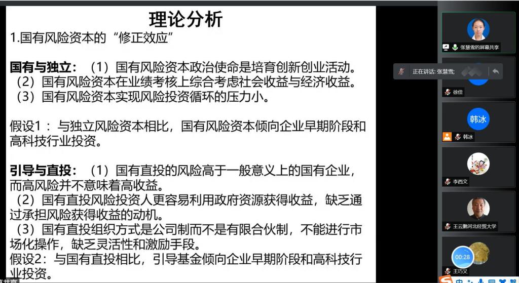 2021年12月12日上午,南开大学与新南威尔士大学联合培养博士张慧雪应乐天使邀请,通过腾讯会议平台为老师们和同学们作题为《政府引导基金对企业创新的影响研究——基于风险投资机构异质性视角》的报告。经理袁振兴、副经理李西文、科研秘书韩冰老师及部分骨干老师和乐天使20、21级研究生参加本次讲座。