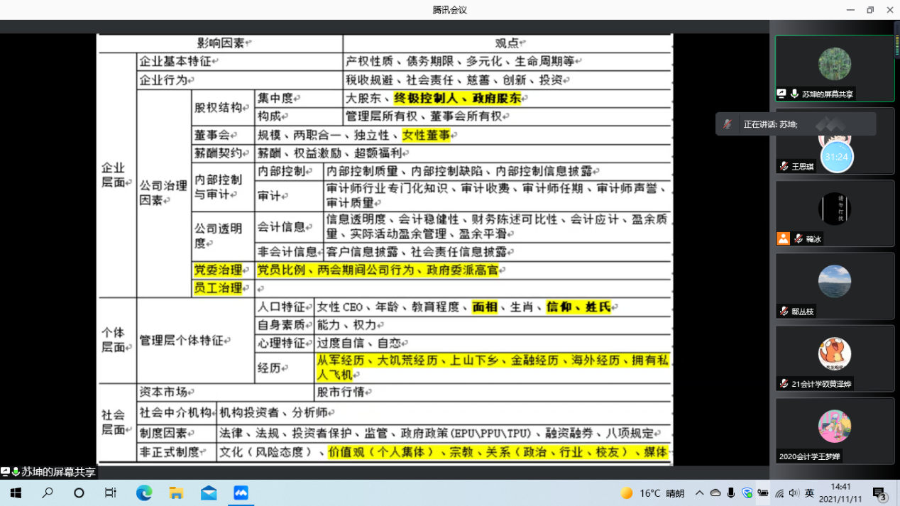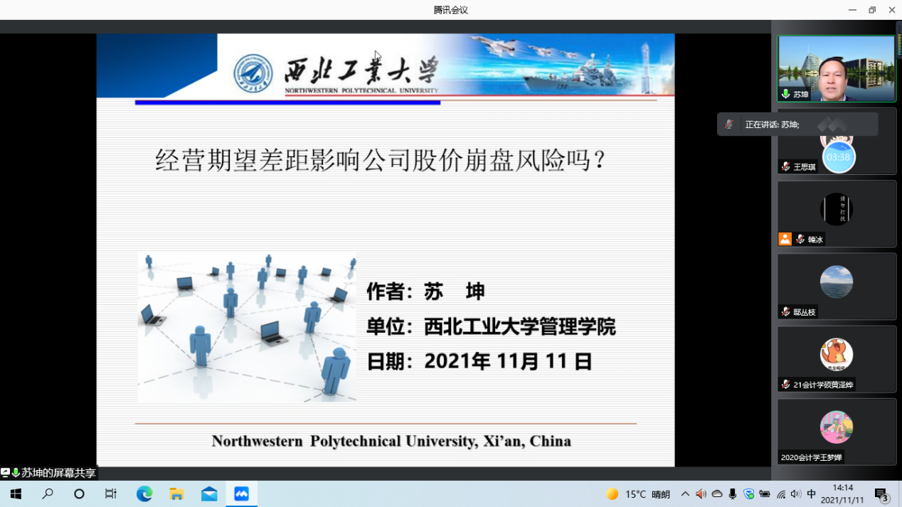 2021年11月11日下午,西北工业大学管理公司会计系苏坤教授应乐天使邀请,通过腾讯会议平台为同学们作题为《经营期望差距影响公司股价崩盘风险吗?》的报告。经理袁振兴、副经理李西文、邸丛枝老师、韩冰老师及乐天使20、21级研究生参加本次讲座。