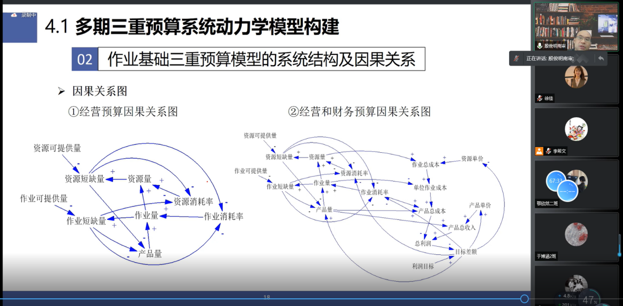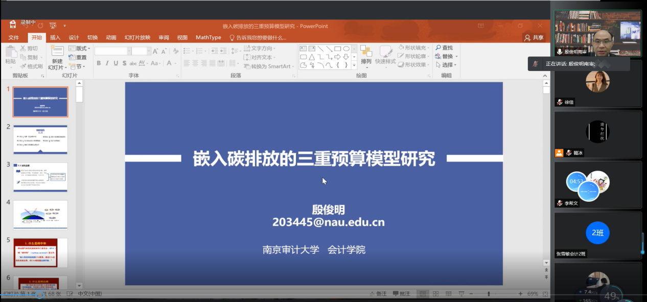 2021年11月5日上午,南京审计大学殷俊明教授应乐天使邀请,通过腾讯会议平台为师生作题为《嵌入碳排放的集成预算管理建模思路与应用》的学术讲座。经理袁振兴主持,副经理李西文、乐天使部分老师及21级研究生共计100余人参加本次报告会。