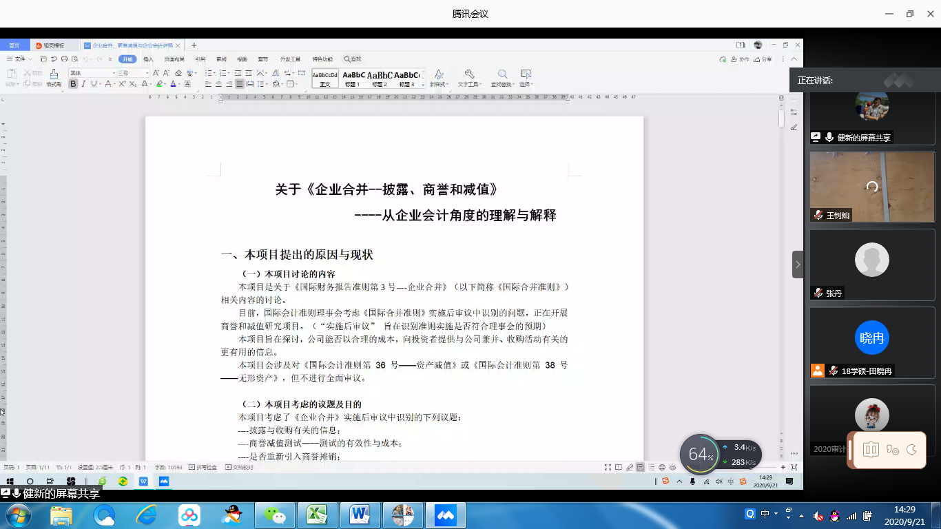 2020年9月21日下午,中国人民大学商公司耿建新教授应乐天使邀请,通过腾讯会议平台为同学们作题为《企业合并——披露、商誉和减值》的报告。副经理李西文及乐天使全体研究生共200余人参加本次讲座。